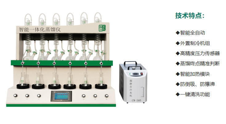 一體化蒸餾儀自動完成加熱、去皮、控溫、壓縮機制冷、冷卻水循環和蒸餾終點判斷。